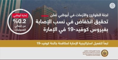 أعلنت لجنة إدارة الطوارئ والأزمات والكوارث الناجمة عن جائحة كورونا في إمارة أبوظبي عن تحقيق انخفاض في نسب الإصابة بفيروس كوفيد-19 إلى 0.2% من إجمالي الفحوصات في الإمارة، تبعاً لتفعيل استراتيجية الإمارة لمكافحة جائحة كوفيد-19 والنجاحات المحققة من خلال التطبيق الصارم للإجراءات الاحترازية والوقائية.