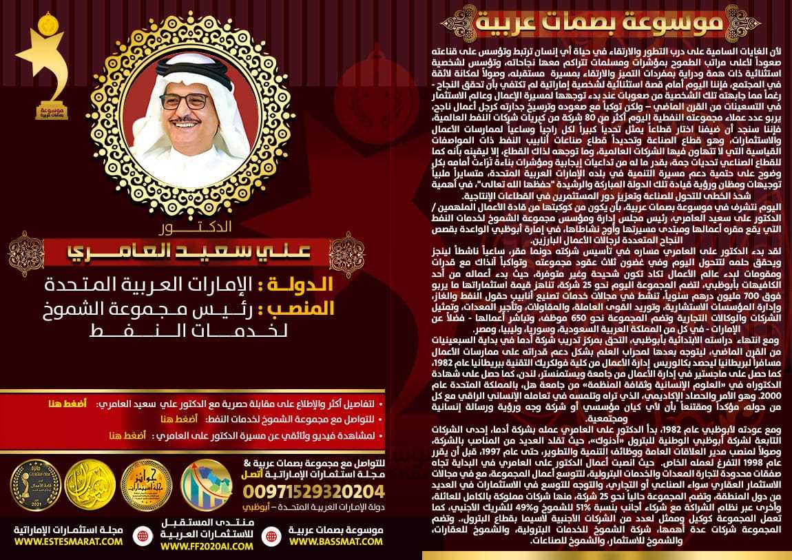 اليوم نتشرف في موسوعة بصمات عربية، بأن يكون من كوكبتها من قادة الأعمال الملهمين / الدكتور على سعيد العامري، رئيس مجلس إدارة ومؤسس مجموعة الشموخ لخدمات النفط التي يقع مقره أعمالها ومبتدى مسيرتها وأوج نشاطاها، في إمارة أبوظبي الواعدة بقصص النجاح المتعددة لرجالات الأعمال البارزين.