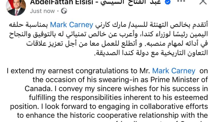 وكتب الرئيس السيسي على حسابه الشخصي فيسبوك : أتقدم بخالص التهنئة للسيد/ مارك كارني Mark Carney بمناسبة حلفه اليمين رئيسًا لوزراء كندا، وأعرب عن خالص تمنياتي له بالتوفيق والنجاح في أدائه لمهام منصبه.