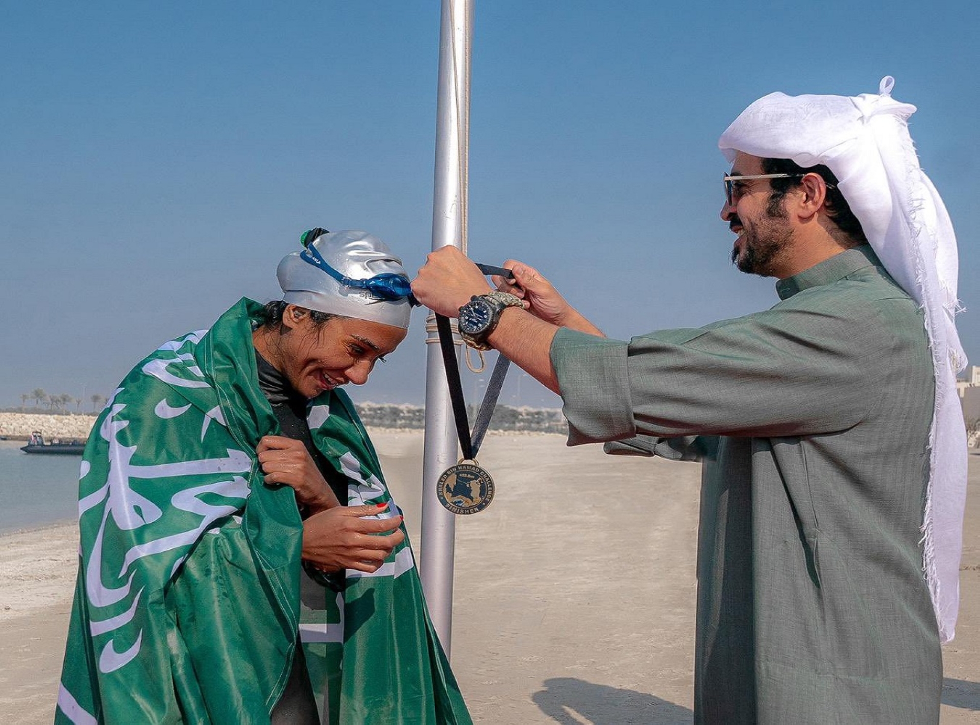 السباحة السعودية مريم صالح بن لادن تحقق إنجازا جديدا باجتيازها لتحدي خالد بن حمد للسباحة، ليستقبلها الشيخ خالد بن حمد آل خليفة ويشيد بإنجازها ويقلدها ميدالية التحدي.