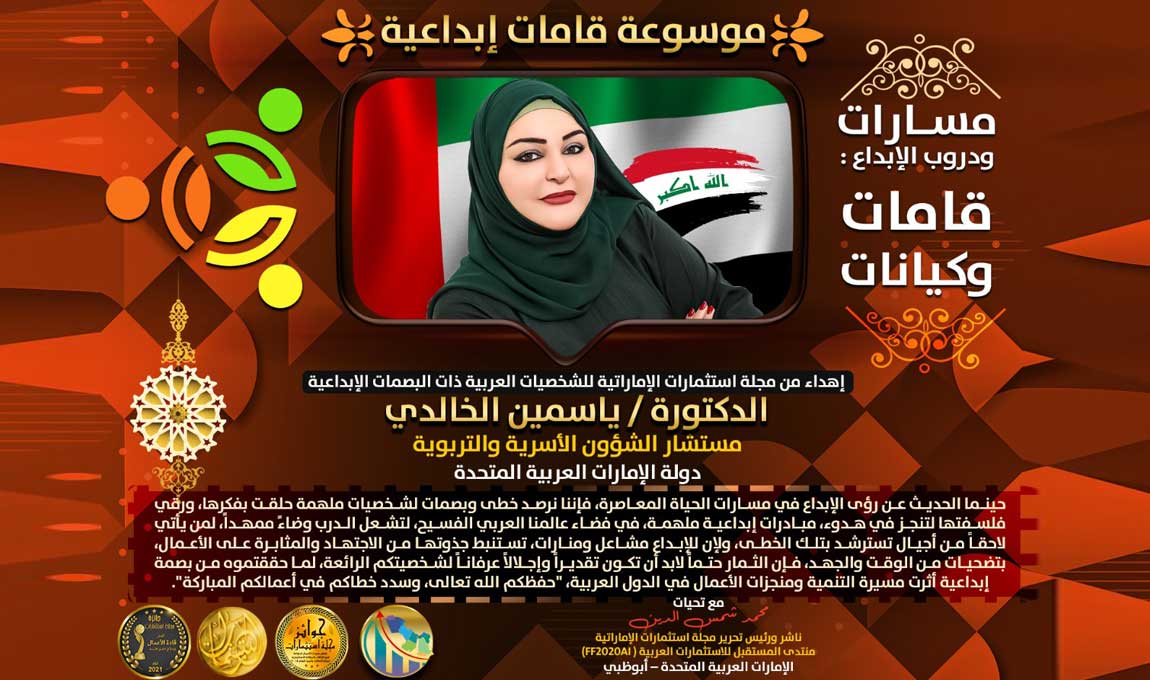 تقديراً لمسيرتها في شؤون دعم المجتمع والأسرة بدولة الإمارات:- الدكتورة / ياسمين الخالدي ضمن موسوعة ” قامات إبداعية”