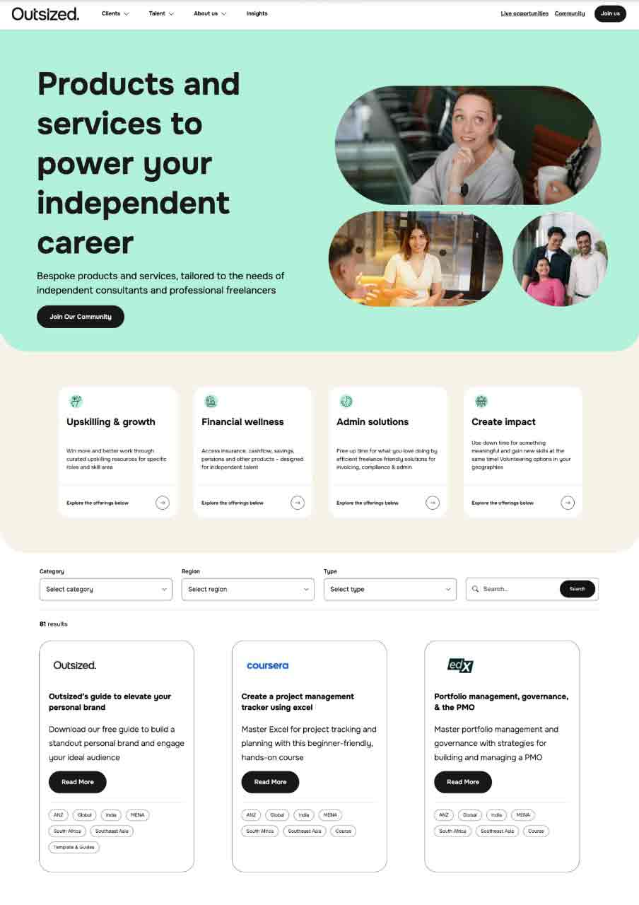 يمكن لجميع المواهب المرنة، بغض النظر عما إذا كانت مسجلة على منصة آوتسايزد، الوصول إلى توصيات “Perks” والاستفادة منها. تواصل المنصة التكيف لتلبية احتياجاتهم المتطورة بناءً على اتجاهات السوق، مما يضمن حصولهم على الأدوات العملية القابلة للتنفيذ لتحقيق النجاح والتفوق في رحلتهم المهنية.