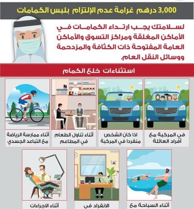 “أزمات وكوارث عجمان”: 3 آلاف درهم غرامة عدم ارتداء الكمام