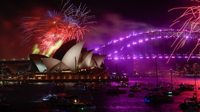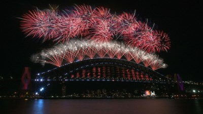 أضاءت الألعاب النارية، في ليلة رأس السنة الجديدة، مساء اليوم، السماء فوق جسر الميناء ودار الأوبرا الشهيرين في مدية سيدني الأسترالية خلال عرض الألعاب النارية.