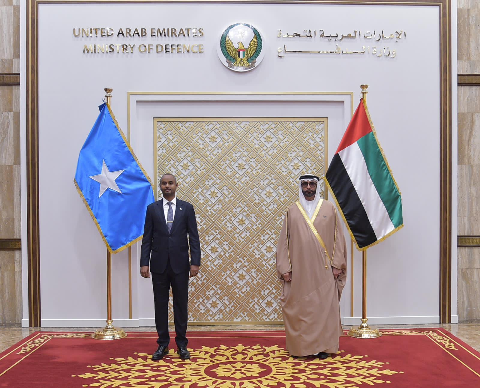ونقل وزير الدولة تحيات صاحب السمو الشيخ محمد بن زايد آل نهيان، رئيس الدولة، ” وصاحب السمو الشيخ محمد بن راشد آل مكتوم، نائب رئيس الدولة رئيس مجلس الوزراء حاكم دبي، وسمو الشيخ منصور بن زايد آل نهيان، نائب رئيس الدولة نائب رئيس مجلس الوزراء رئيس ديوان الرئاسة، إلى فخامته وتمنياتهم لجمهورية الصومال الفيدرالية وشعبها الشقيق بمزيد من التقدم والازدهار.