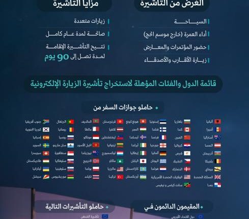 وبإمكان مواطني هذه الدول التقدم عن طريق زيارة صفحة التأشيرات بمنصة “روح السعودية” http://Visa.visitsaudi.com، حيث تمتد صلاحية تأشيرة الزيارة لمدة عام كامل، وتتيح الزيارات المتعددة والإقامة لمدة تصل إلى 90 يوماً، ويمكن لحامليها أداء العمرة والزيارة طوال العام “ما عدا موسم الحج”، كما يمكنهم الاطلاع على ما تقدمه روح السعودية من معلومات ثرية، وباقات مميزة، وتجارب سياحية متنوعة وملهمة، في جميع مناطق المملكة؛ ويأتي هذا القرار في سياق جهود منظومة السياحة السعودية، وتكاملها مع العديد من الجهات الحكومية في سبيل تحقيق تطلعات القطاع السياحي المتناغمة مع رؤية السعودية 2030، والرامية إلى جذب المزيد من شرائح الزوار حول العالم, بالإضافة إلى ترسيخ مكانة السعودية على خارطة السياحة العالمية.​
