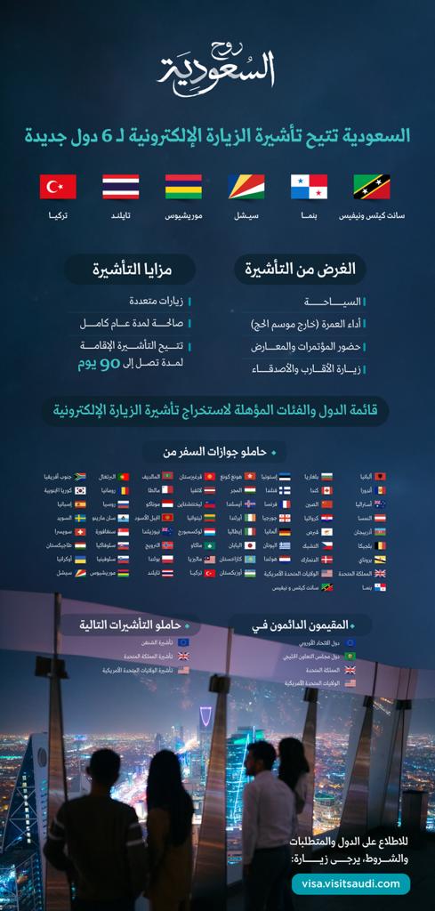 جددت الهيئة السعودية للسياحة ترحيبها بالزوار من كل أنحاء العالم؛ مؤكدةً على أهمية إعلان وزارة السياحة بالتعاون مع وزارة الداخلية، ووزارة الخارجية، ووزارة الحج والعمرة، والجهات ذات العلاقة، عن إتاحة تأشيرة الزيارة “إلكترونياً” لمواطني دول تركيا، وتايلند، وبنما، وسانت كيتس ونيفيس، وسيشل، وموريشيوس، ليصبح بذلك إجمالي الدول المؤهلة لتأشيرة الزيارة الإلكترونية 63 دولة.​
