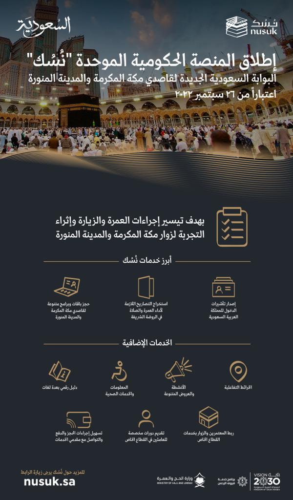 أعلنت وزارة الحج والعمرة اليوم عن إطلاق المنصة الحكومية الموحدة “نُسُك” nusuk.sa، لتكون البوابة السعودية الجديدة لقاصدي مكة المكرمة والمدينة المنورة، بهدف تطوير تجربة ضيوف الرحمن، وتيسير إجراءات قدومهم لأداء العمرة والزيارة من جميع أنحاء العالم، وذلك ضمن مبادرات برنامج خدمة ضيوف الرحمن- أحد برامج رؤية السعودية 2030-.