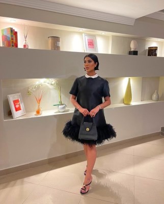 أطلت ليلى عبد الله في حفل خطبة أخيها فيصل بفستان جذاب باللون الأسود من How she wears it، بتصميم قصير حتى الركبة، ونصف أكمام مع ياقة نصف دائرية مغلقة بيضاء، في حين كان الفستان مزينًا بطبقة كثيفة من الريش بشكل دائري من أسفل، ونسقت مع اللوك تسريحة الشعر “الكاريه”، ومكياج ناعم بالألوان الترابية، وصندل بكعب عال لمزيد من الجاذبية، بالإضافة إلى حقيبة أنيقة من Givenchy بنفس لون الفستان.