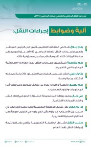 وأكدت وزارة التعليم أن طلب النقل لشاغل الوظيفة التعليمية ينتهي بإعلان نتيجة إجراءات النقل لهذا العام، مشيرةً إلى أنه سيتم تطبيق الأنظمة واللوائح تجاه مَنْ يخالف ضوابط وسياسات أمن المعلومات وتجاوز الصلاحيات، وفي حال وجود بيانات غير صحيحة؛ فللوزارة الحق في إلغاء عملية النقل، مبينةً أنه إذا تم إلغاء نقل شاغل الوظيفة التعليمية بعد تنفيذ الإجراءات لأي سبب فلا يلزم نقل الذي يليه في الترتيب حرصاً على استقرار العملية التعليمية.