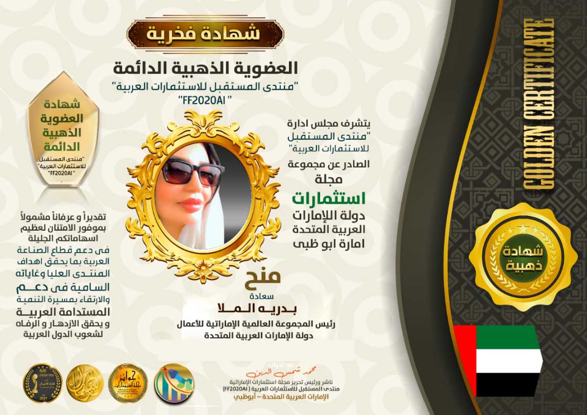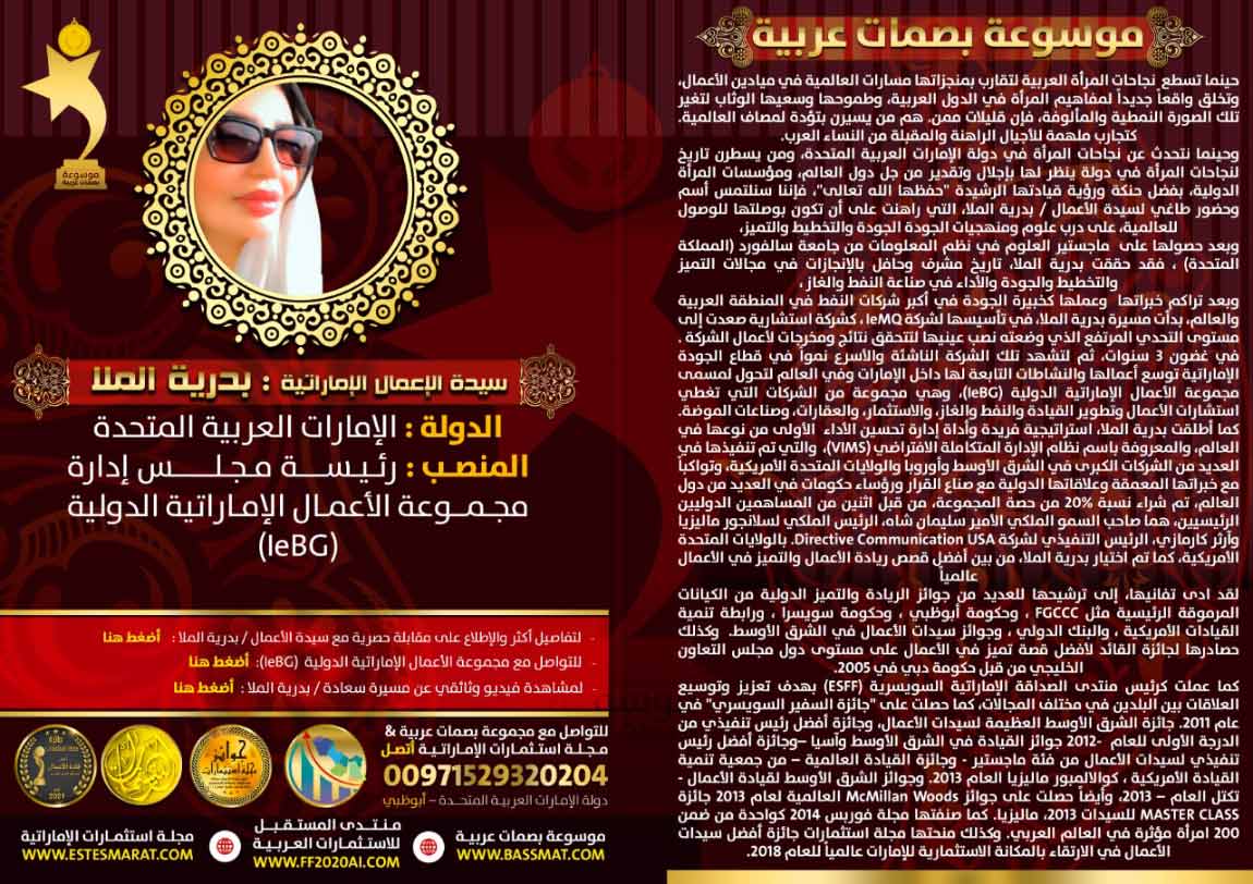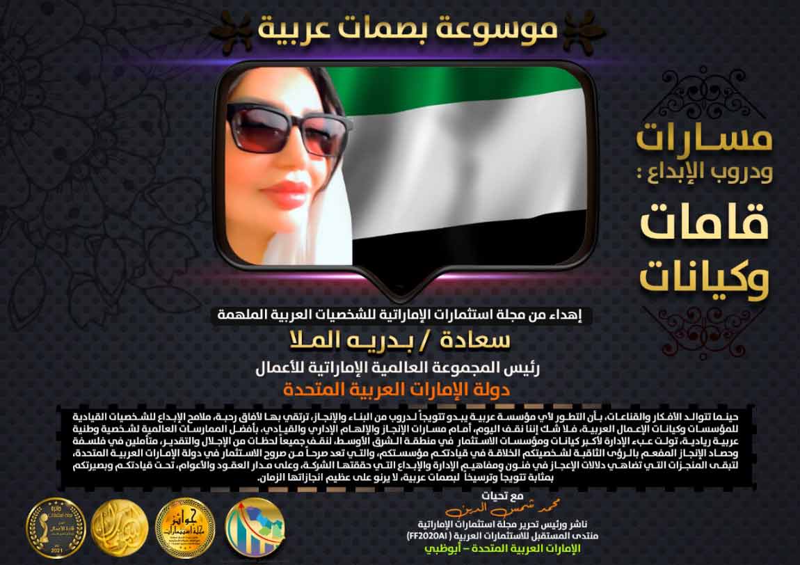 أعلنت مجموعة مجلة استثمارات الإماراتية، ومنتدى المستقبل للاستثمارات العربية “FF2020AI “، عن اختيار سيدة الأعمال الإماراتية، سعادة/ بدرية الملا، رئيسة مجلس إدارة المجموعة العالمية الإماراتية للأعمال، ضمن موسوعة “بصمات عربية”، تقديراً لمسيرتها في دعم قطاع الاستثمارات والأعمال في الدول العربية، حيث اتسمت بحنكة إدارية وتحقيق مؤشرات إداء وقيمة مضافة في قطاع الأعمال بدولة الإمارات، توافقاً مع مستهدفات ورؤية القيادة الرشيدة لدولة الإمارات في تعزيز دور قطاع الأعمال، ودعم إسهاماته ومردوداته على مسيرة التنمية الاقتصادية بالدولة ككل. لتشكل تلك المسيرة من العمل والاجتهاد لشخصيتها المقرونة بمحفزات الإبداع والحنكة الإدارية إسهامات جوهرية لقطاع الأعمال في الإمارات.