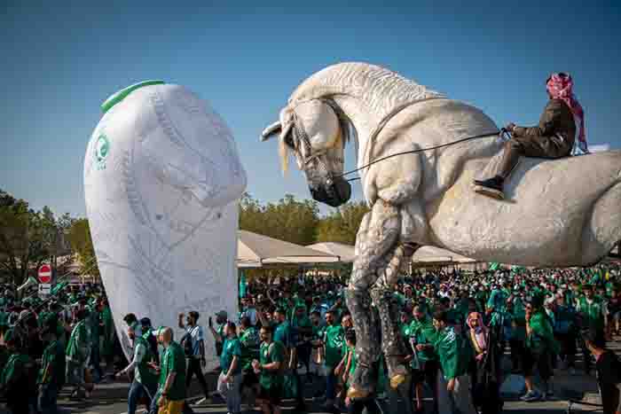 وكان الجمهور السعودي قد نظم مسيرته الأولى التي حملت اسم «فوق هام السحب» في ملعب لوسيل، دعماً وتشجيعاً للصقور الخضر في مواجهتهم أمام منتخب الأرجنتين، التي انتهت بفوز ثمين للمنتخب السعودي، بنتيجة 2-1، متصدراً بذلك المجموعة.