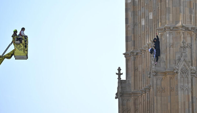 تسلق رجل إلى حافة أعلى برج قصر وستمنستر المعروف باسم برج ساعة بيج بن الشهير الذي يضم مقر البرلمان البريطاني وسط لندن، حاملا معه العلم والكوفية الفلسطينية.