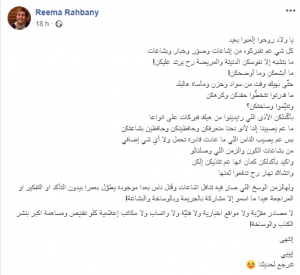 وقالت ريما: “لهالزمن الوسخ اللي صار فيه تناقل اشاعات وقَتل ناس بعدا موجودة يطوّل بعمرا بيدون التأكد او التفكير او المراجعة هيدا ما اسمو إلا مشاركة بالجريمة وبالوساخة والبشاعة!”.