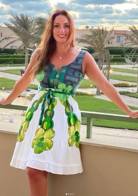 دمج فستان الفنانة نرمين الفقي القصير بين الألوان الأبيض والأخضر مع نقوشات من الورود ورود من Desigual وسعره 73.55 دولار أي ما يعادل 1411 جنيها.