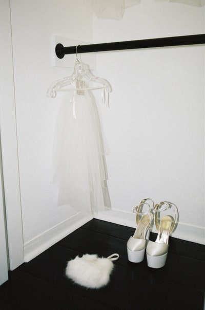 وفي الصورة الثانية ظهر حذاء العروس الأبيض والمصمم من مجموعة Giuseppe Zanotti، كما ظهر الوشاح الأبيض الذي ستضعه على رأسها وهو بطول الكتفين والمطوي على قوس ساتان.