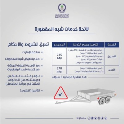 ونوه إلى عدد من الاشتراطات الفنية المستحدثة من قبل وزارة الداخلية لتسجيل وترخيص شبه المقطورات، والتي اشتملت على سلامة الإطارات، وصلاحية هيكل شبه المقطورة وربط الإضاءة الخلفية بالمركبة مع إضاءة شبه المقطورة، بالإضافة إلى توفر مثلث العاكس (ويستثنى من ذلك توافر المثلث في مركبة المتعامل)؛ كونها أحد أهم عناصر الأمان والسلامة في المركبة، مع ضرورة وضع الأرقام في مكان ظاهر وواضح، حيث تعامل شبه المقطورة مع المركبة كوحدة واحدة، وتحمل الرقم نفسه، علماً بأن التأمين غير إجباري عليها، مشيراً إلى نص مخالفة المادة رقم (96) من قانون السير والمرور الذي يقرر غرامة مقدارها 1000 درهم على قائد المركبة الذي يحمل شبه مقطورة غير مرخصة.