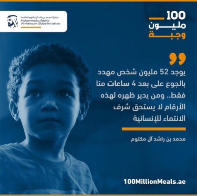أطلق صاحب السمو الشيخ محمد بن راشد آل مكتوم، نائب رئيس الدولة رئيس مجلس الوزراء حاكم دبي، رعاه الله، حملة 100 مليون وجبة التي تعتبر أكبر حملة من نوعها لإطعام الطعام وتوزيع 100 مليون وجبة في 20 دولة في المنطقة.
