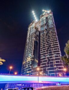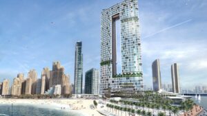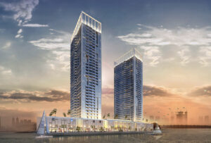 نعم هذا البرج اسمه هو : ابراج بوابة الجميرا التوئم (Jumeirah Gate Towers) وهو عبارة برج مزدوج مكون من 74 طابقا متعدد الاستخدامات بارتفاع حوالي 290 مترا ، ويضم فندق 5 نجوم ( فندق الادرس ) بطاقة 182 غرفة و عدد 479 شقة سكنية بالاضافة الى 496 شقق فندقية مخدومة ، وبمساحة بناء تبلغ 242 الف متر مربع ويقع المشروع في نهاية منطقة جميرا بيتش ريزيدنس JBR ويطل المشروع على الشاطىئ ، المشروع يتكون من 3 مستويات يحتل الفندق 14 طابقا اما الشقق الفندقية فهي 54 طابقا ، ويعلو المبنى مطعم فريد من نوعه بالاضافة الى المطاعم العالمية الفخمة ، كما ان البرجين متصلين مع بعضهما بواسطة برج علوي فضلا عن اتصالهما من قاعات اللوبي .
