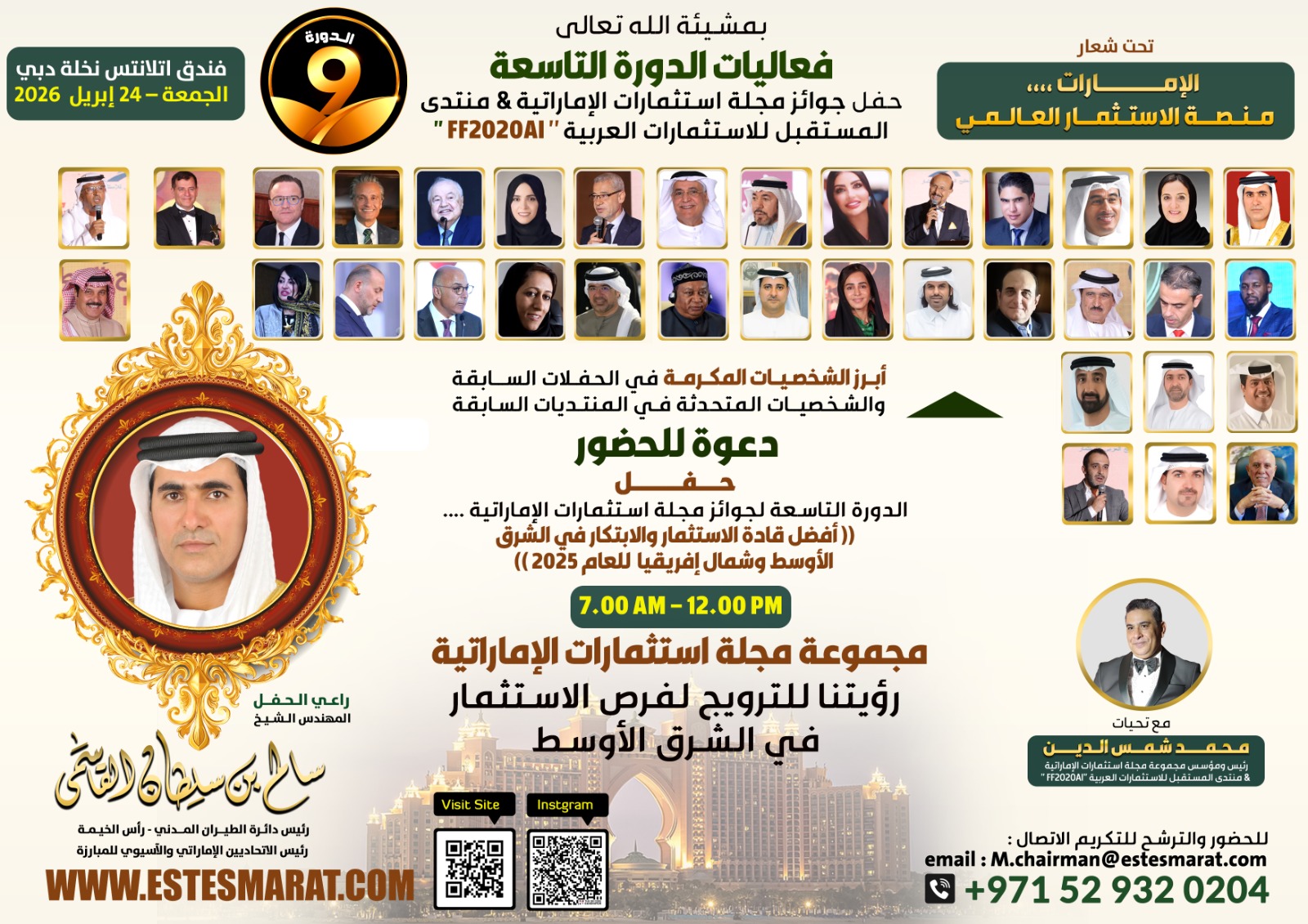 تستعد مجلة “استثمارات الإماراتية”، وتحت رعاية وحضور المهندس الشيخ / سالم بن سلطان القاسمي رئيس الاتحادات الأسيوية والإماراتية للمبارزة – الراعي الشرفي للحفل، وبتنظيم الخبير الاقتصادي والإعلامي العربية / محمد شمس، مؤسس ورئيس مجموعة مجلة استثمارات الإماراتية، ومنتدى المستقبل للاستثمارات العربية ” FF2020AI “،