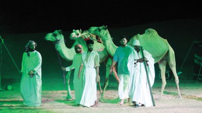 يبدأ الجزء الاستهلالي للمسرحية التي عرضت مؤخراً بمهرجان الشارقة للمسرح الصحراوي، بتناول طقوس الاستسقاء والدعاء كي تهلّ بشائر المطر وتروي سكان قبيلة «المنارة» الذين هلك حرثهم وتضررت مواشيهم وإبلهم وخيولهم من القحط وشحّ المياه، ويلجأ مخرج العرض «سلي عبدالفتاح» إلى حيلة ذكية بتحويل أجساد الممثلين إلى ما يشبه الغيوم البيضاء المتحركة وكأن القيمة الروحية للدعاء باتت متحقّقة من شدة الحاجة وإلحاح الطلب، وهو ما يحدث فعلاً بعد أيام قليلة عندما تهطل الأمطار بغزارة. ووسط هذا الكرنفال الاحتفالي بميلاد الحياة في الطبيعة المقفرة، ينعطف المسار السردي للعرض نحو فضاء حكائي مختلف ومتشعب، يبدأ مع احتفاء أفراد القبيلة بـ«محمد البارّ» الورع والتقي وصاحب الأخلاق الرفيعة الذي كان وجوده في القبيلة سبباً في حلول البركة عليها، وزيادة الأمن والاطمئنان فيها.
