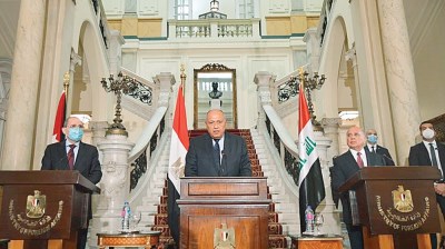 جاء ذلك خلال مؤتمر صحفي لوزراء خارجية مصر والعراق والأردن بالقاهرة، أمس، بعد جلسة مباحثات تناولت آلية التنسيق الثلاثي لدعم التعاون في مختلف المجالات الاقتصادية خاصة الطاقة والربط الكهربائي والنفط وإعادة الإعمار، والاتفاق على استمرار المباحثات بين الوزارات الفنية لمواصلة التعاون.