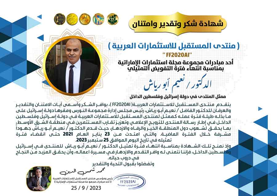 كرم منتدى المستقبل للاستثمارات العربية( FF2020AI )، والذي يعد أحد مبادرات مجموعة مجلة استثمارات الإماراتية، الدكتور / نعيم أبو رياش، رئيس مجلس إدارة مجموعة النورس ومقرها دولة إسرائيل بمناسبة انتهاء فترة تمثيله للمنتدى في دولة إسرائيل وفلسطين الداخل على ما بذله طيلة فترة عمله كممثل لمنتدى المستقبل للاستثمارات العربية حيث قدم الدكتور / نعيم أبو رياش جهوداً مشرفة خلال فترة تفوضيه التمثيلي للمنتدى والتي بدأت من شهر يناير العام 2021 حتى تاريخ 25 سبتمبر العام الحالي 2023.