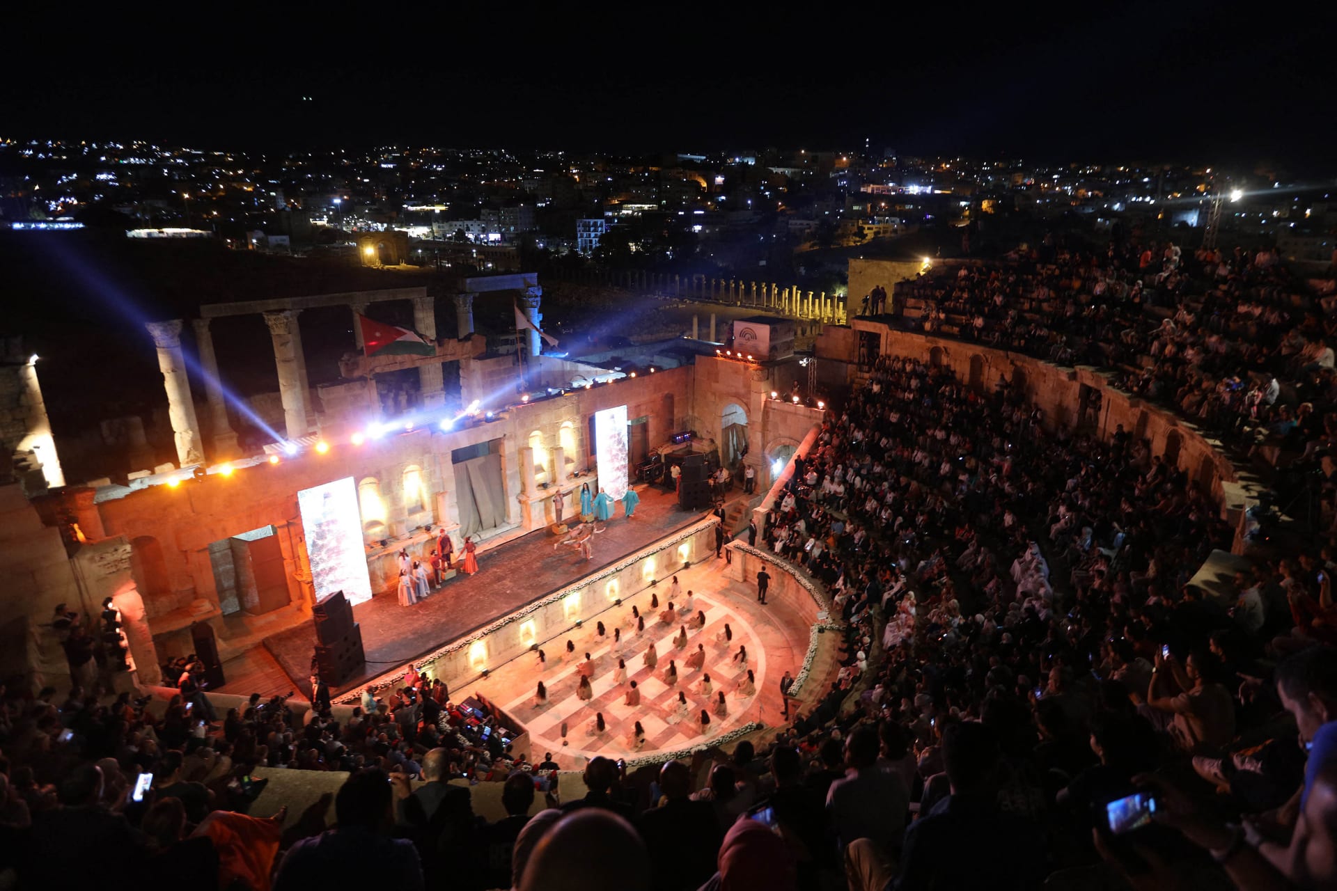 . انطلقت فعاليات مهرجان جرش للثقافة والفنون بدورته الاستثنائية الـ 38، في المدينة الأثرية شمال الأردن، بحفل افتتاح استهل بأغنيات وطنية صدحت بها حناجر الفنانين الأردنيين عمر العبداللات وديانا كرزون ونداء شرارة ورامي شفيق ومروة ناجي ومحمد الحلو من مصر.