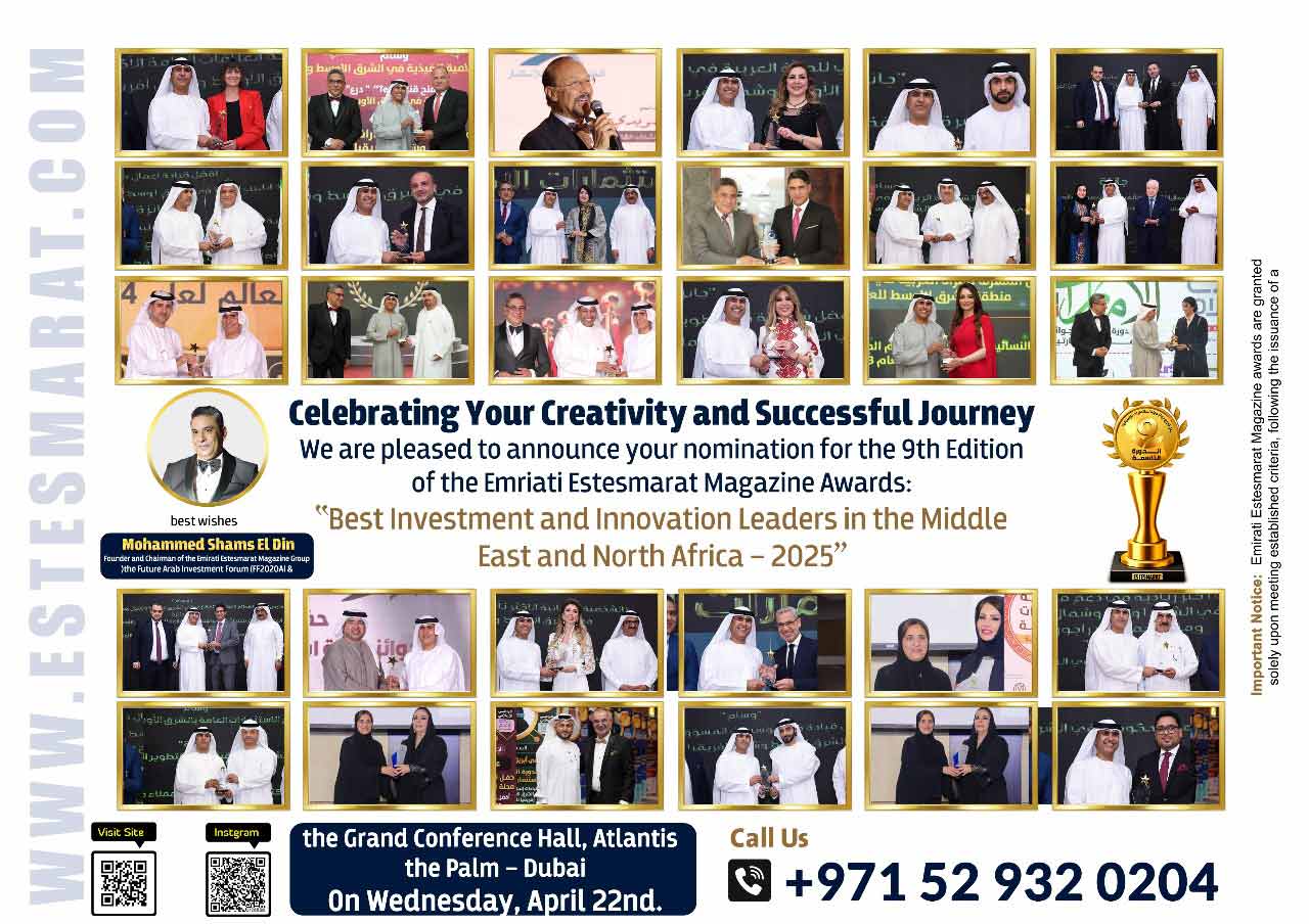 The Emirates Estesmarat Magazine has confirmed that its 9th awards ceremony for the year 2025 will be held in the evening of April 22, 2026, following the conclusion of the conference. The prestigious event, titled: