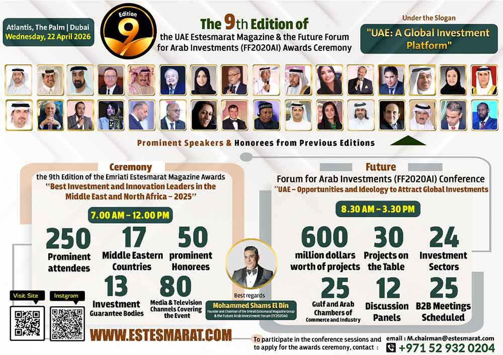 The 9th edition, scheduled for Wednesday, April 22, 2026, God willing, will be held at the Grand Conference Hall, Atlantis, The Palm, Dubai. The day will feature the conference titled: “UAE: Opportunities and Ideology to Attract Investments”, which is held under the auspices of the Future Forum for Arab Investments (FF2020AI) — an initiative established by the Emirates Estesmarat Magazine Group in the aftermath of the COVID-19 pandemic.